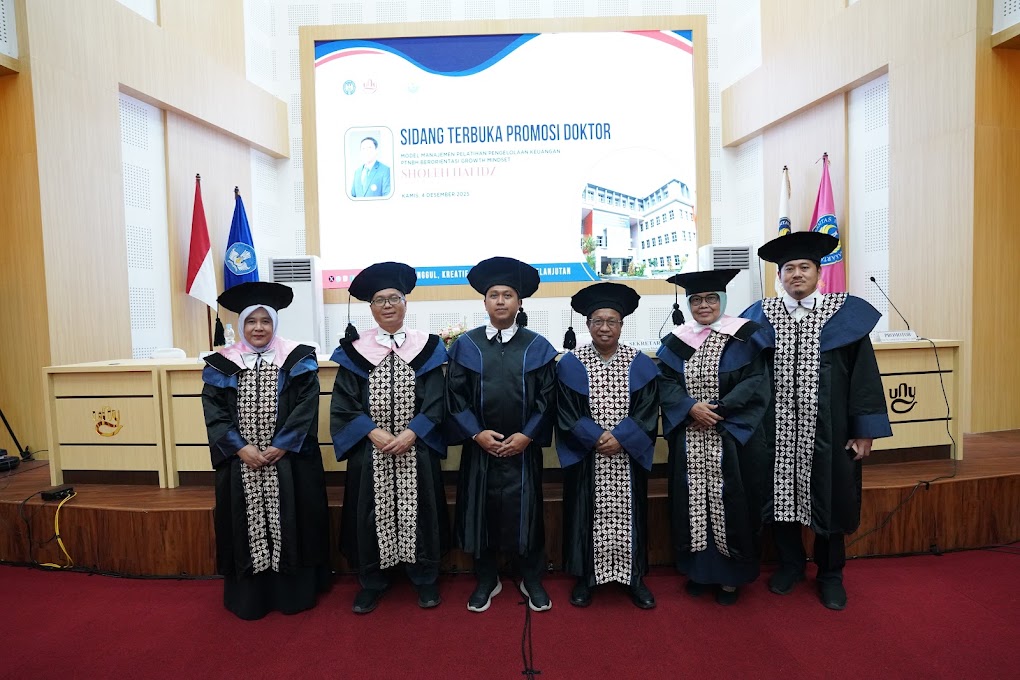 Fakultas Ekonomi dan Bisnis Universitas Negeri Yogyakarta (FEB UNY) menggelar Sidang Promosi Doktor bagi dosen Departemen Manajemen, Sholeh Hafidz, pada Kamis (4/12/2025) di Ruang Sidang FEB UNY. Dalam ujian terbuka tersebut, ia mempresentasikan dan mempertahankan disertasi berjudul “Model Manajemen Pelatihan Pengelolaan Keuangan PTNBH Berorientasi Growth Mindset.”