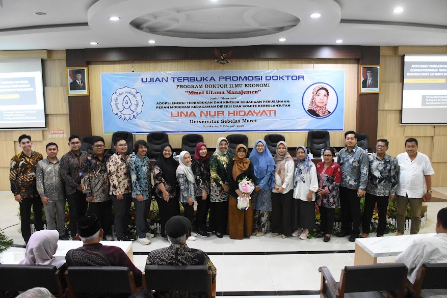 Dr. Lina Nur Hidayati, S.E., M.M. menyelesaikan Sidang Promosi Doktor pada Kamis, 9 Februari 2026 di Program Doktor Ilmu Ekonomi Minat Manajemen, Fakultas Ekonomi dan Bisnis, Universitas Sebelas Maret (UNS), Surakarta. Dalam sidang tersebut, Dr. Lina Nur Hidayati, S.E., M.M. mempertahankan disertasi berjudul “Adopsi Energi Terbarukan dan Kinerja Keuangan Perusahaan: Peran Moderasi Keragaman Direksi dan Komite Keberlanjutan.”