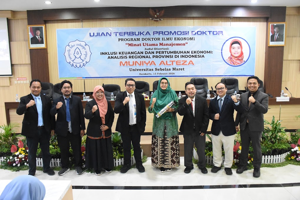 Dr. Muniya Alteza, S.E., M.Si. resmi meraih gelar doktor setelah menjalani Ujian Terbuka Promosi Doktor Program Doktor Ilmu Ekonomi dengan Minat Utama Manajemen di Fakultas Ekonomi dan Bisnis, Universitas Sebelas Maret, pada Kamis, 13 Februari 2026, di Surakarta.
